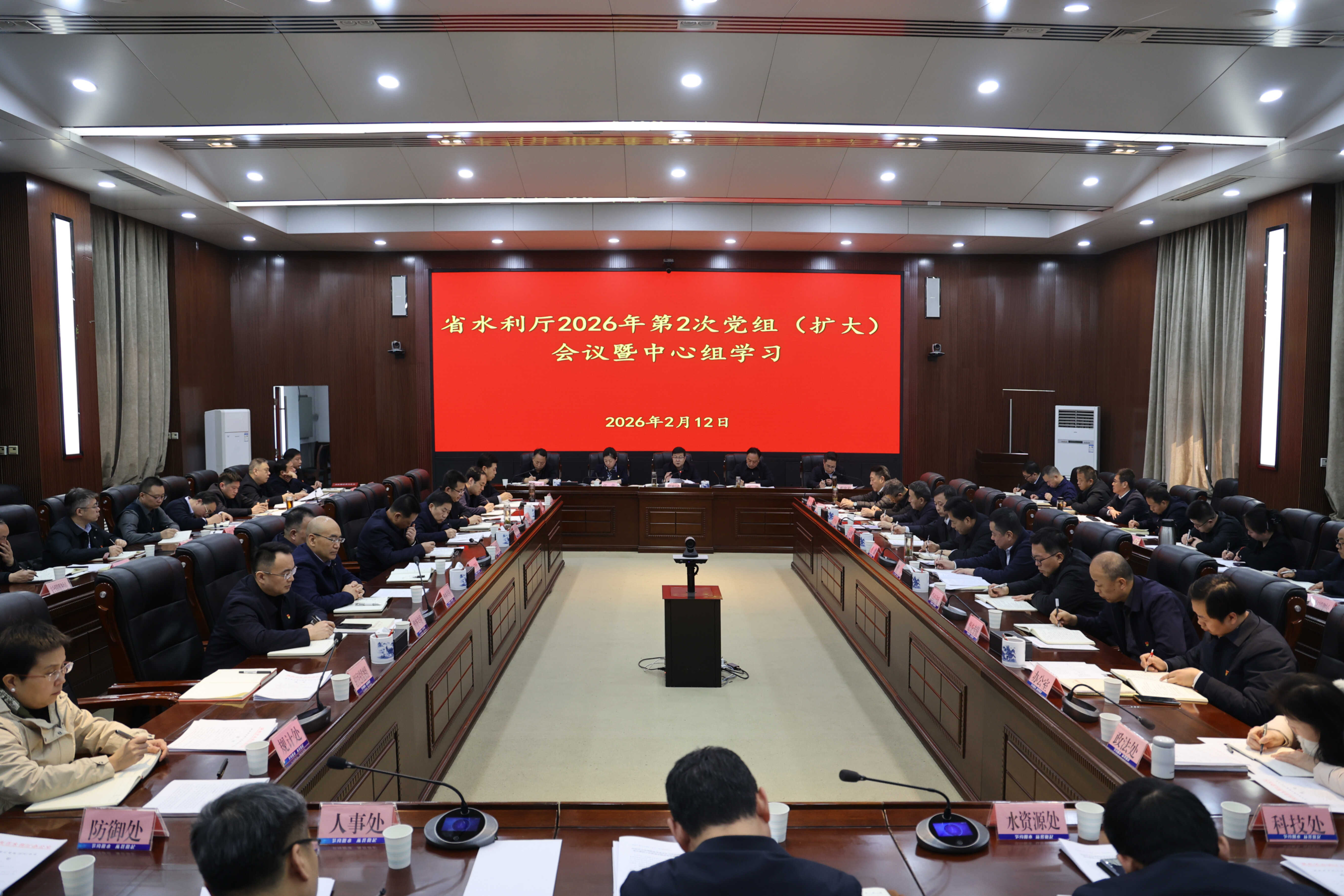 2月12日,省水利厅党组书记、厅长郑维国主持召开2026年第2次厅党组(扩大)会议暨理论学习中心组学习,深入学习《习近平生态文明思想学习纲要》,认真学习习近平总书记重要讲话精神和关于做好“三农”工作的重要指示,重温2015年2月习近平总书记来陕考察重要讲话精神,传达学习2026年中央一号文件和全省群众身边不正之风和腐败问题集中整治工作推进会精神,研究贯彻落实工作,并安排部署春节期间各项工作。厅党组成员围绕学习党的二十届四中全会精神和习近平关于治水重要论述,结合工作职责,就开好民主生活会交流发言。